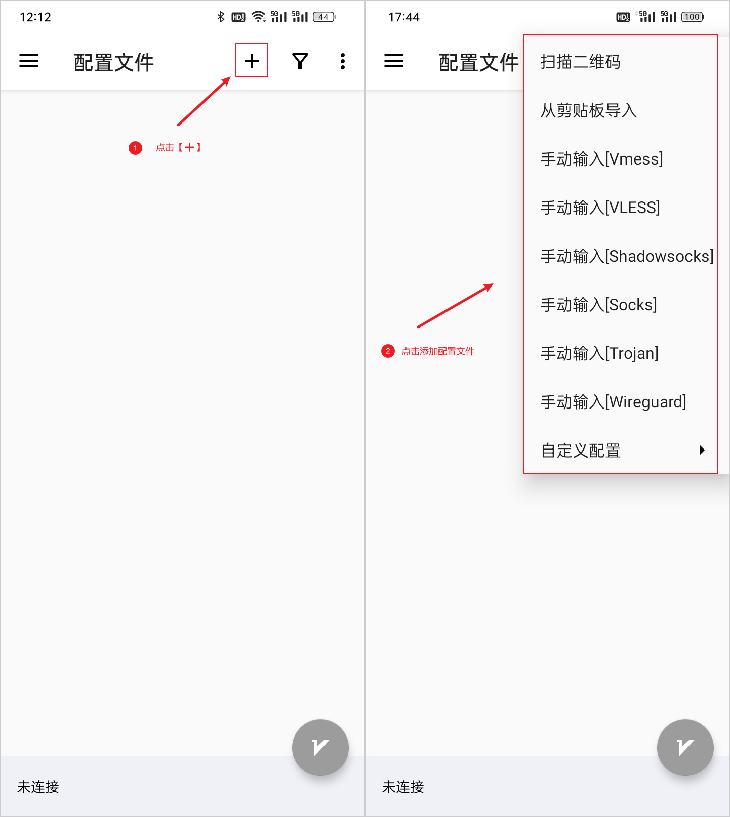 获得节点服务器信息后,就可以开始添加配置文件了,点击软件主界面右上角的 ➕ 号按钮即可出现添加配置文件选项,如上图 V2rayNG 主界面所示,根据不同的节点添加不同的节点服务器配置文件。