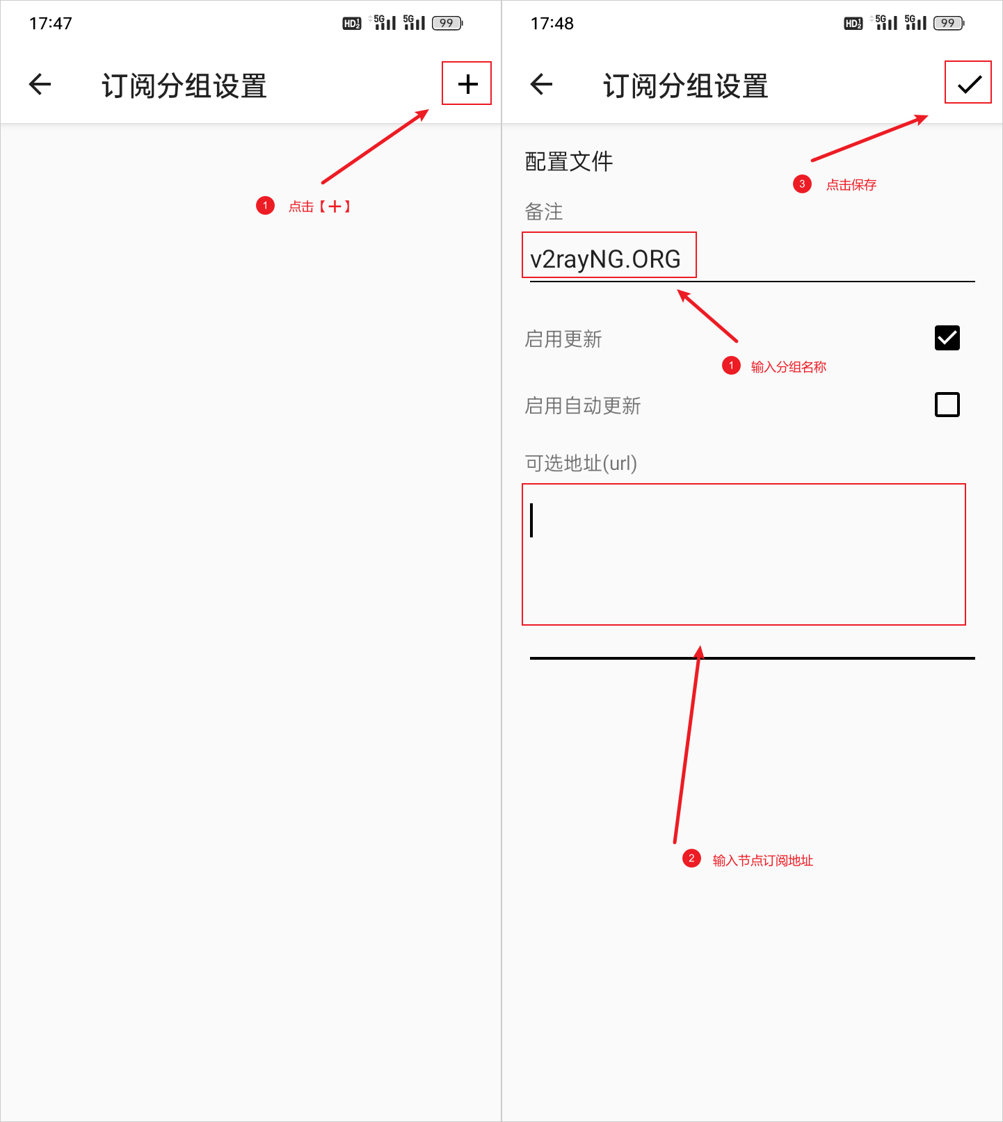 在弹出的订阅设置主界面,点击右上角的 ➕ 号按钮即可出现添加订阅界面,在备注处输入自己能区分这个订阅节点的内容,然后在地址(url)处输入订阅地址,最后点击右上角的 ✔ 按钮,即可添加订阅地址,如下图所示。