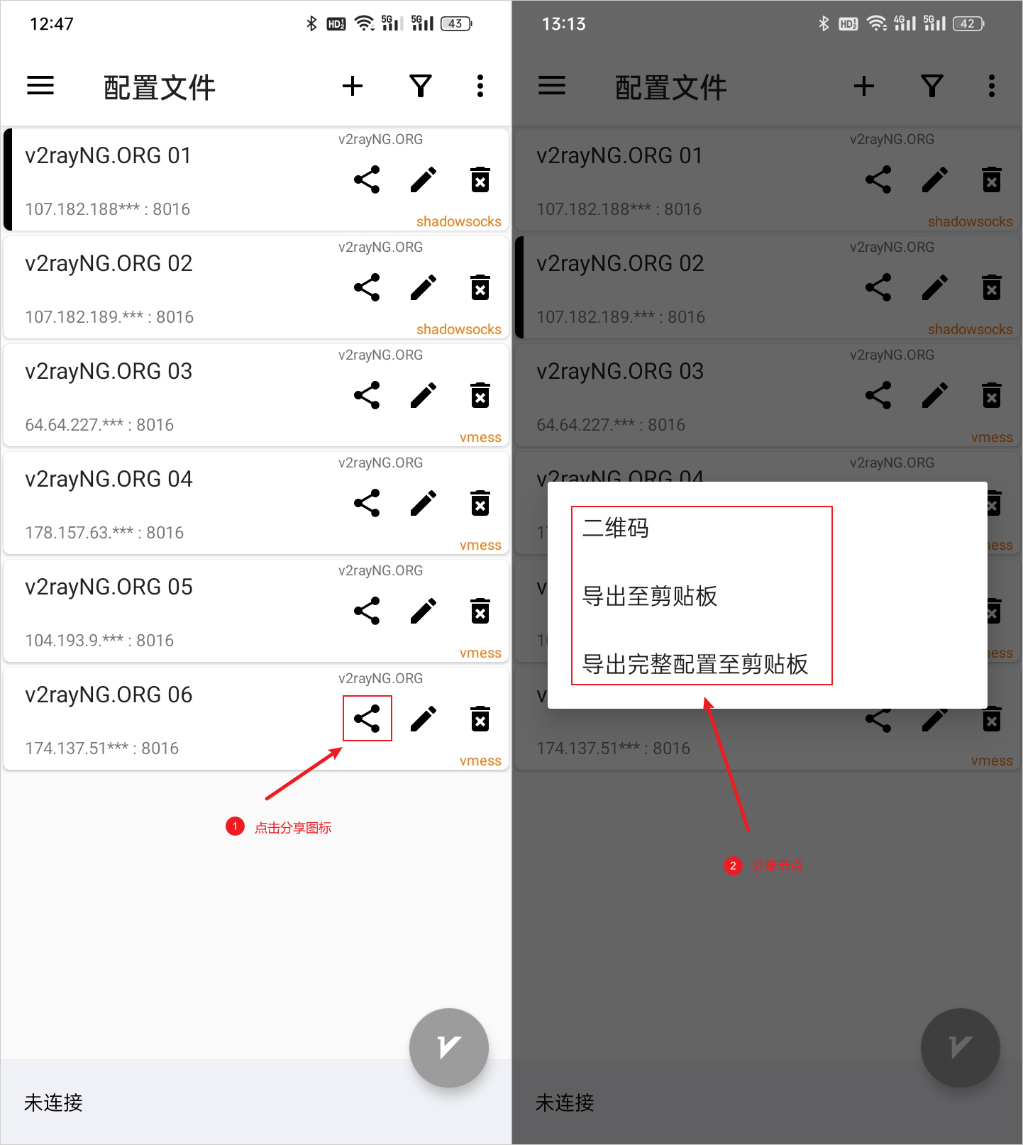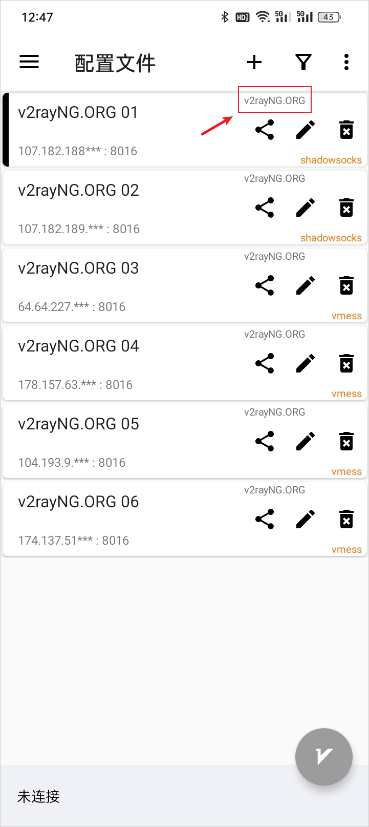 每一条代理服务器的操作都可以在这里进行,右边三个图标分别代表分享节点服务器、编辑节点服务器、删除节服务器,如下图所示。